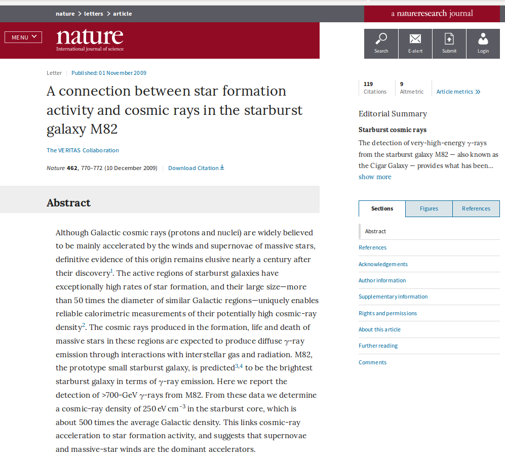 "A connection between star formation activity and cosmic rays in the starburst galaxy M82", Acciari et al. 2009, Nature.